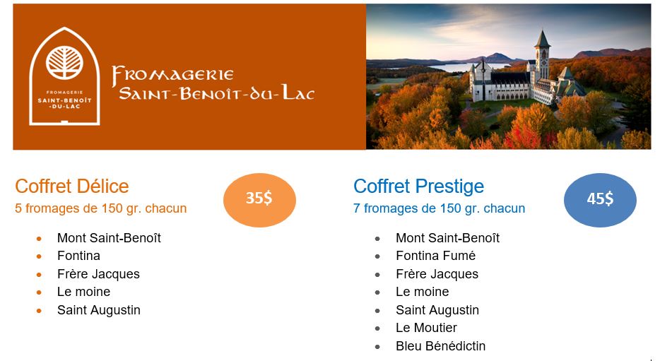 Les délicieux fromages de l’Abbaye St-Benoit sont de retour pour le temps des fêtes. Ils vous sont offerts en deux format de coffrets. Vous pouvez commander dès maintenant et jusqu’au mercredi 12 novembre les coffrets vous seront remis avant les messes du 29 et 30 novembre. Tous les fonds amassés serviront à soutenir les activités des jeunes ADOS de la paroisse. Notez qu’il n’y aura pas de campagne de fromages au printemps 2026, nous regardons actuellement d’autres options de financement à vous proposer!